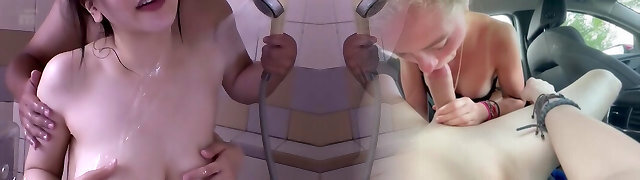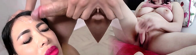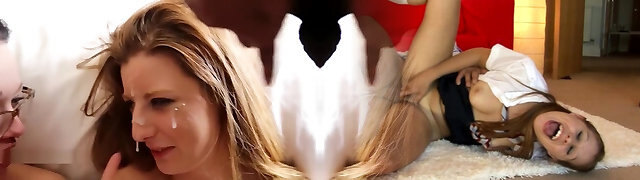 Lusty sluts Louise Lee and Pixiee Lil' suck dick and take bukkake facials