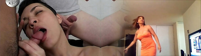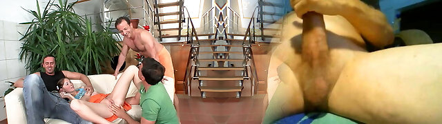 MILF with nice tits gets fucked as she slurps on cocks in couch