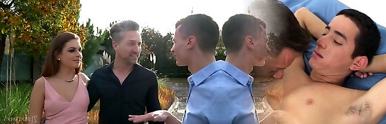 French outdoor gangbang for curvy brunette Milf and all of her fuck-holes