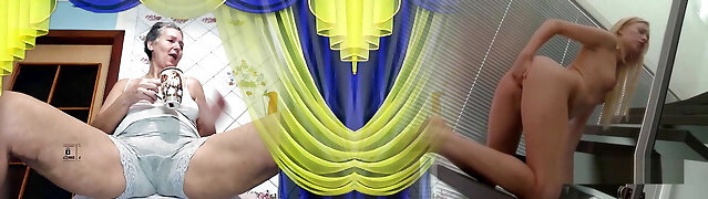 Old sexy Lukerya. Lengthy pantaloons with lace cut into the gash. Bottom view. Hairy pussy and big round ass.