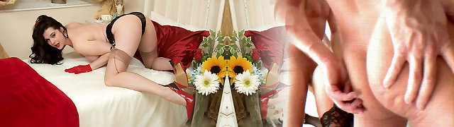 Hot busty Cougar wanks in lace gloves high heels and nylons