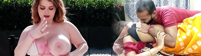 Blondie seduces a pool boy by flashing him with her hefty bra-stuffers