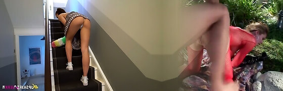 Mischievous girl sits on the stairs while kittling her wet pussy a bit
