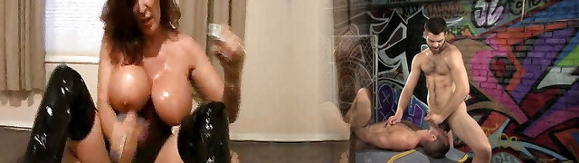 Oiled appetizing curvaceous Milf Alice brings boy delight by giving titjob
