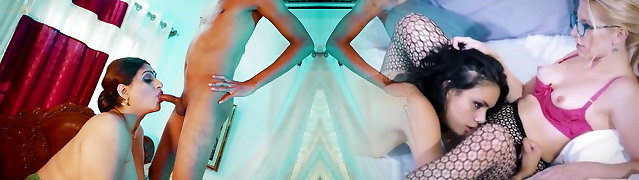 The poor guy barely managed to handle two horny black-haired milfs and a cheeky blonde