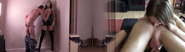 Female Domination strapon pegging. Dominatrix drills a slave in a chastity belt in the ass. Great strapon session