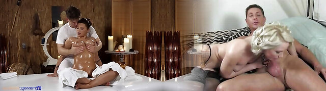Massage threesome with chesty ladies that like oiled up sex