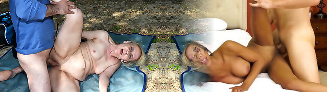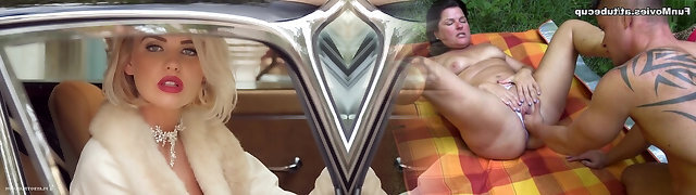 Beautiful blond cougar in gorgeous lingerie plays with her fantastic boobs outdoor