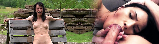 Anorexic dark haired hussy gets her slim bod tied up to wooden fence outdoors