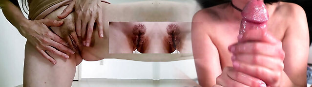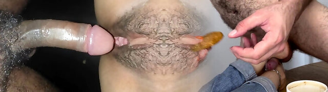 Girl groans and moans when a ginormous cock fucks her ass and hairy cunt