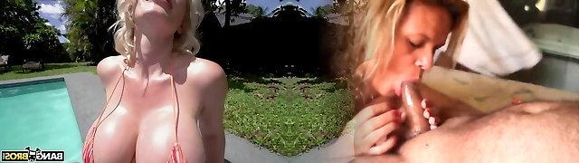 Mega busty milf in bikini swallows big man sausage and gives a titjob