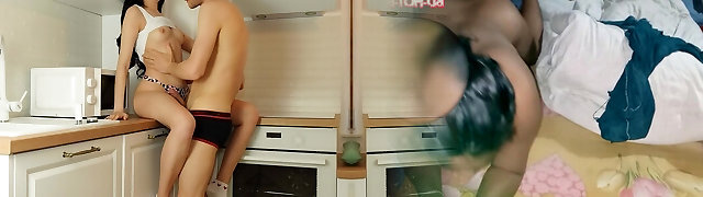 Fast Orgasmic sex after kissing in the kitchen. Money-shot in mouth