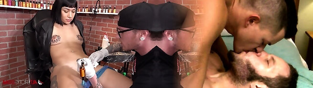 Selena gets a tattoo then fellates 2 cocks