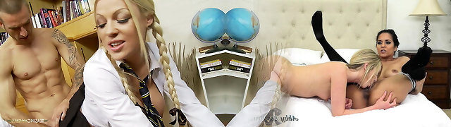 Strict head master punishes ultra-kinky blonde cheerleader with strapon