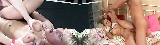 疯狂的家伙处理一个令人兴奋的towheaded fucky-fucky炸弹到一个四人