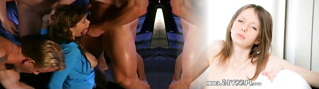 丰满的金发女郎重磅炸弹让几个角质螺柱蹂躏她的洞