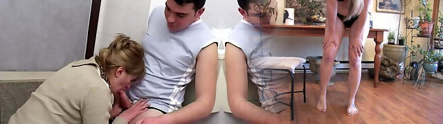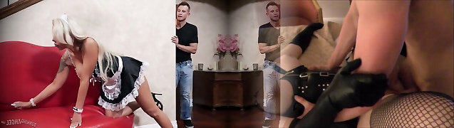 丈夫boinks巨大的保险杠金发女郎的妻子和法国女仆在一起