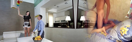 淘气的拉丁女佣雪莉月显示她的阴部和获取性交