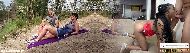 户外。 特写。 可怕的混蛋。 里贾纳黑deepthroats一个好大小的人造公鸡