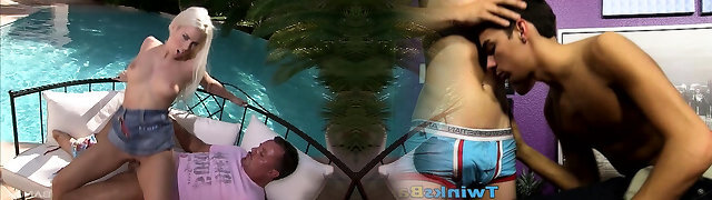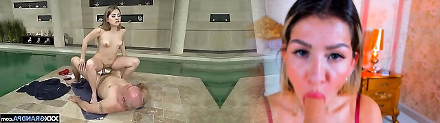 瘦瘦的青少年骑在一个老男人的大鸡巴在游泳池
