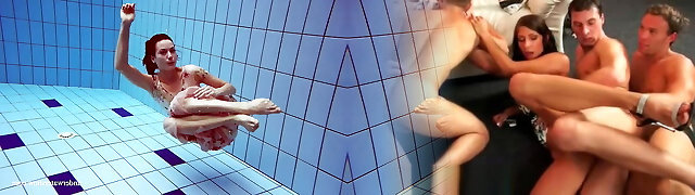 狡猾的少女与厚厚的tatas有一些欢乐潜水在游泳池