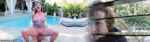 下垂tittied美洲狮得到她的屄啜通过附近的游泳池的年轻邻居