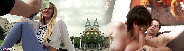 丰满的金发女郎有性别的钱在公共