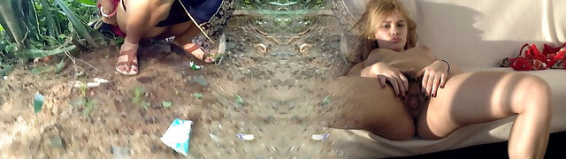 大胸无经验的金发女郎在公共户外钻