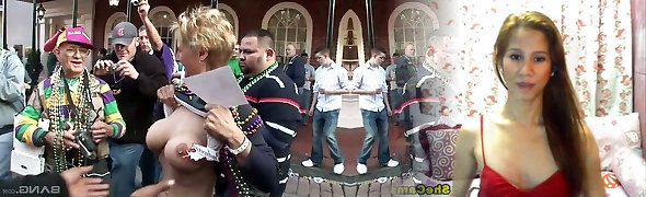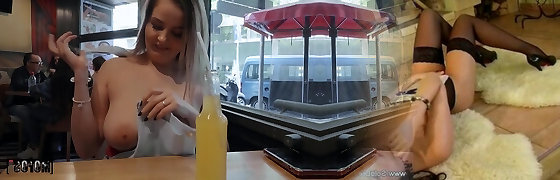 妻子撕破她的衬衫,闪烁着她的乳头让所有人看到