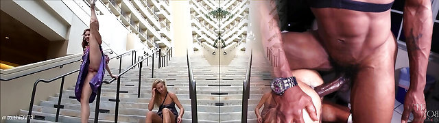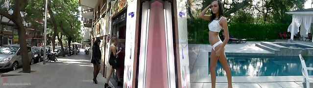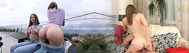 Boinked她在住宅楼前的阳台和一个活跃的道路,Pop-shot在她的Donk
