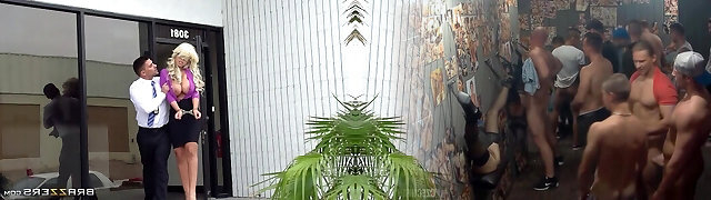 美妙的金发女郎色情行业明星布里奇特撕毁了僵硬的小狗式