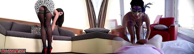 Buxom spex美洲狮在紧身衣拖着阴茎